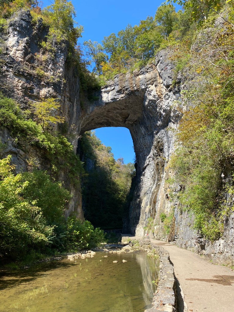 - We left home to drove to Shenandoah. On our way, we stopped at Natural Bridge State Park in Virginia. Admission was $30 for our family. We did the hike that goes under the Natural Bridge to a waterfall (easy, family friendly hike). We looked around in the visitor center, and then we ate a picnic lunch in the parking lot with the food we packed in our cooler. All together, our visit here was from about 11:30am-2:00pm.